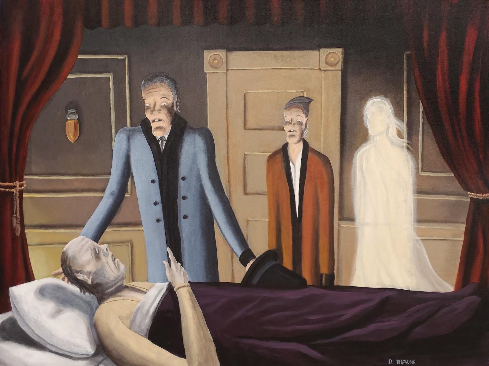 This is the one painting in the series lifted entirely from the 1951 screen adaptation. There's scant mention of Marley's demise in the backstory of the Dickens novel, whereas the movie devotes quite a bit of time to it. Despite its absence from the original story, I thought to include it because it presented a chance to see the current Scrooge standing shoulder-to-shoulder with a seven-year's-younger version of himself, as he and the Ghost look in on Marley's deathbed. At the end of the day, this is my least favorite piece in the exhibit, in part because it turned out a little bit too grim (and this from a fan of grim, lol).